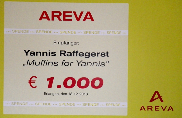 "Muffins für Yannis" bei AREVA Die Veranstaltung war sehr gut besucht und die, von neun lieben Kolleginnen von meinem Papa selber gebackenen und gespendeten, Muffins gingen weg "wie warme Semmeln". Vielen Dank an Vina, alle Muffinsbackfeen und natürlich auch alle fleissigen Muffins-Esser! Meinem Spendenkonto wurde die grandiose Summe von 1000 € gutgeschrieben!