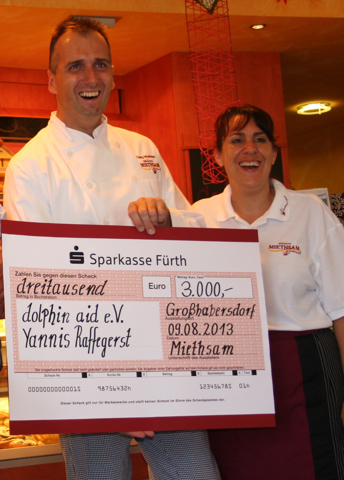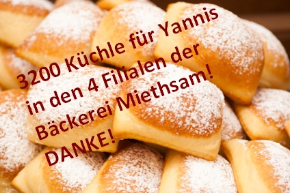 Küchle für Yannis Die Aktionstage fanden statt in Ammerndorf: 05. Juli 2013 --> 800 Küchle verkauft !!! Das war eine für mich sehr erfolgreiche Aktion! 3200 verkaufte Küchle! Zusammen mit den Spendendosen kam eine Ich danke der Familie Miethsam, dem Team der Bäckerei und natürlich allen Küchle-Käufern!!! Ihr seid SUPER!