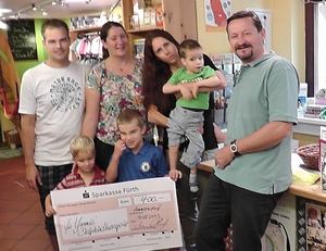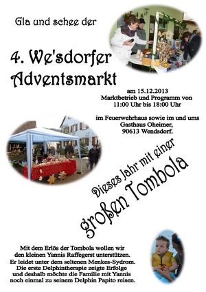 Tombola auf dem Adventsmarkt in Wendsdorf Von 13-15 Uhr waren Mama und Papa bei der Gewinnausgabe. Vielen herzlichen Dank für diese tolle Unterstützung mit einer Summe vom 700 €! Diese Spende wurde am 06.01.2013 im Rahmen des Neujahrsempfangs der Gemeinde Großhabersdorf an meine Mama symbolisch übergeben. --> Zeitungsbericht zum Adventsmarkt vom 04.01.2014