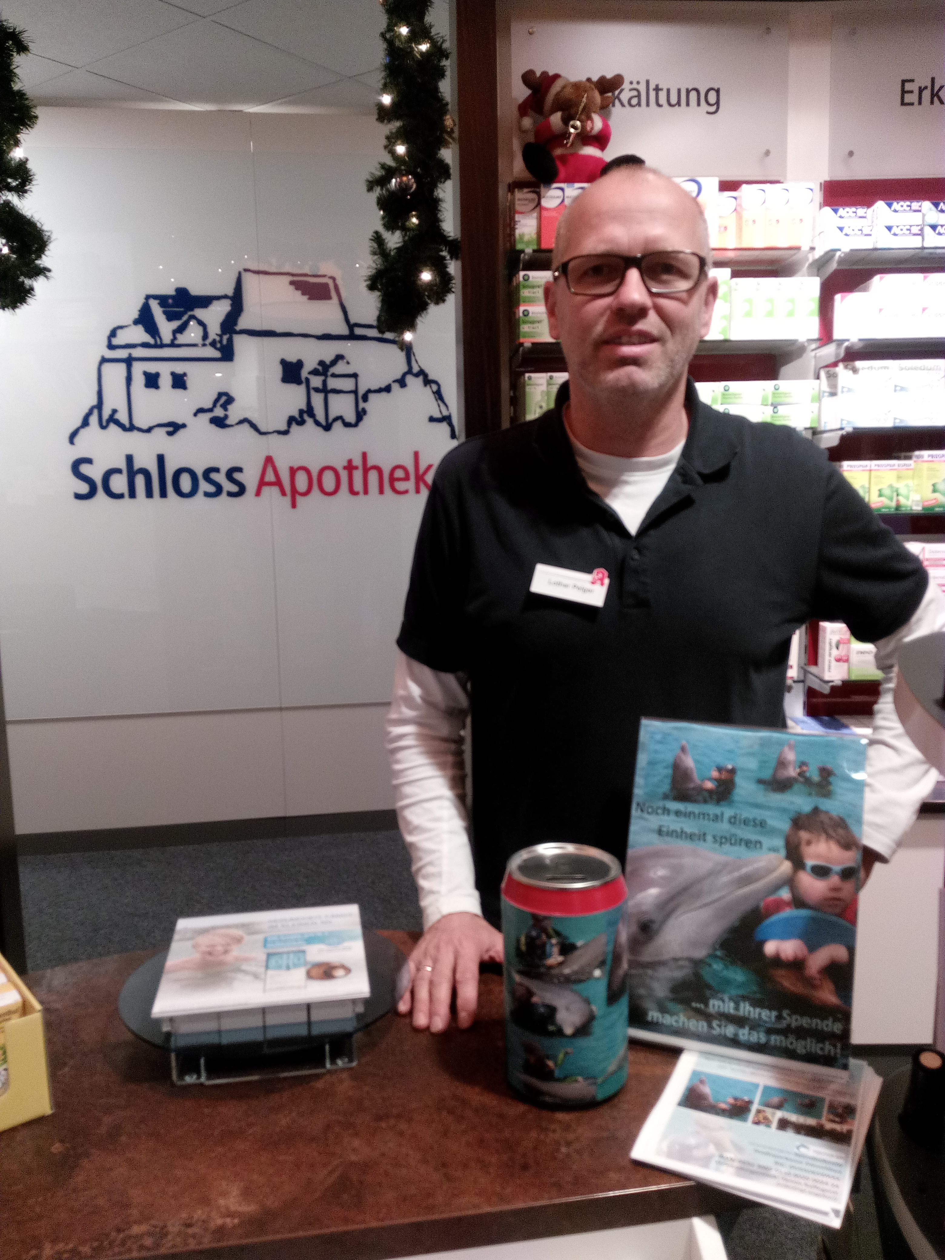 Spendendose in der Schloss Apotheke Cadolzburg Herr Pelger unterstützte Yannis's Delphintherapie mit dem Aufstellen einer Spendendose in seiner Apotheke Vielen Dank allen Spendern!